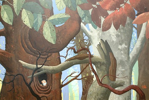 SCOTT, Walt, (American, 1894-1970): Cartoon illustration of a little person in a forest, Gouache, sight size 17 3/4'' x 26 1/2'', signed lower right. Walt Scott originally worked for Disney but is more famous for his Sunday only comic titled ''The Little People''. He also illustrated in Dell's four color comics and in the 50's he put out the newspaper comics, ''The Magic Egg'', ''The Little Blue Duck'', and ''The Animals' Christmas''.