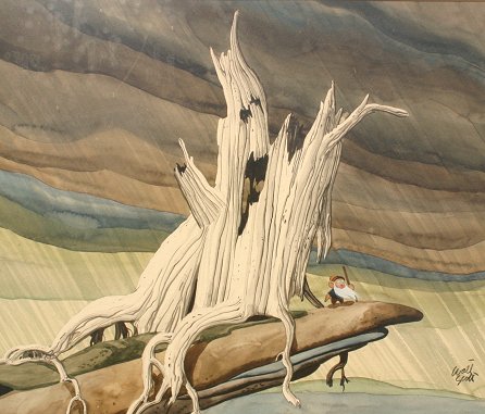 SCOTT, Walt, (American, 1894-1970): Cartoon illustration of a little person on a cliff with rotted tree root in stormy weather. W/C/Gouache, sight size 12 3/4'' x 15''. Walt Scott originally worked for Disney but is more famous for his Sunday only comic titled The Little People. He also illustrated in Dell's four color comics and in the 50's he put out the newspaper comic, ''The Magic Egg'',''The Little Blue Duck'', and '' The Animals' Christmas''.