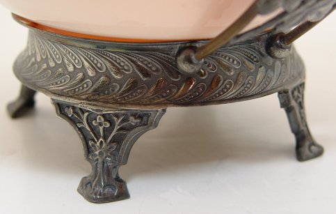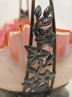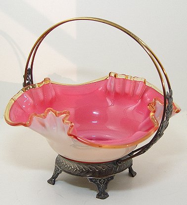 CRANBERRY GLASS BRIDE'S BASKET WITH SILVERPLATE HOLDER: Cased cranberry glass with amber edging. Silverplate frame is by Southington Co., it has fancy feet and flowering vine creeping up the handle. Bowl is 10 1/2'' dia., handle of basket reaches to 10''.