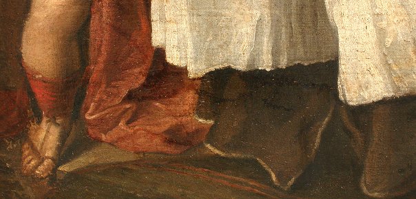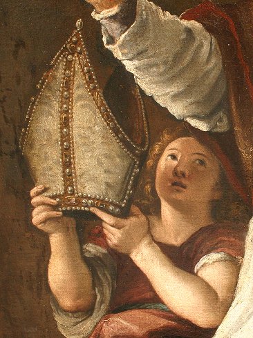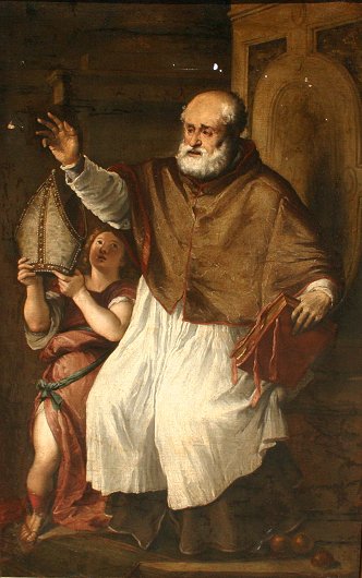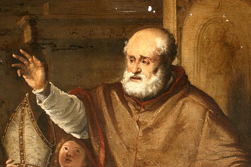 AFTER (TIZIANO, Vecelli), TITIAN, (18TH-19TH Century?): St. Nicholas of Bari, O/C, 58 1/2'' x 37'', from the Virginia Newton of Sarasota, Florida Estate, sold at Christie's New York in 1989 Old Master Sale. Condition - Has been relined. Several punctures in the upper portion of canvas, scrape in left and right margin. in-painting throughout. Needs some work.