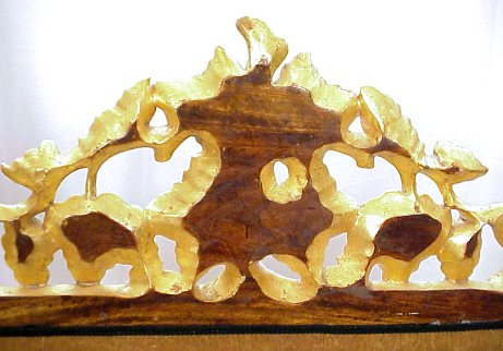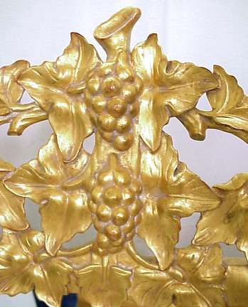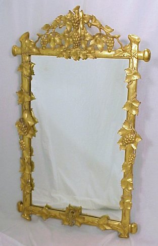 DECORATIVE GOLD LEAF MIRROR IN A GRAPE MOTIF: Classically designed gold leaf mirror crested and framed in grapes. 51'' x 32''. Est. $260/400**
