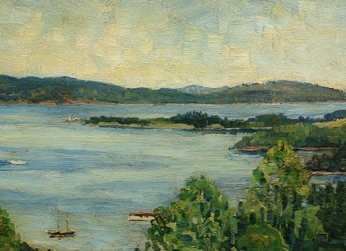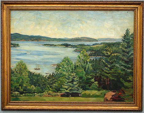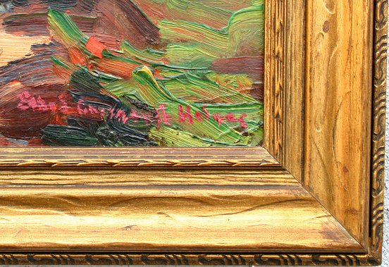 HOLMES, Ethel Greenough, (American, 1879-): Panoramic river landscape, O/B, 19 1/2'' x 26 1/2'', signed lower right, encased in original gilt frame, has a Plaza Art Gallery located in Missouri framing label affixed verso. Condition - Needs cleaning, several paint chips, paint flaking in the upper left corner.