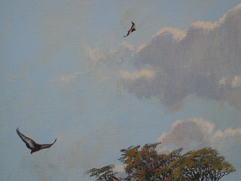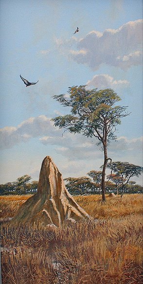 MALICK, Donald L., (American, 20th C): African landscape with termite mound and vultures soaring, O/C, 15'' x 30'', signed lower right, encased in wooden frame, 38'' x 22 3/4''. Malick is a contemporary wild life artist, in particular bird artist, regarded as being in the top percentile of living nature artist, has worked for Audubon Magazine, National Geographic, and extensively illustrated the Birds of Colorado, published by the Denver Museum of National History.
