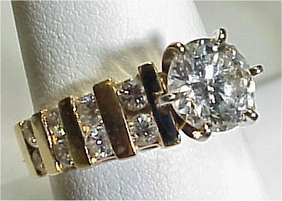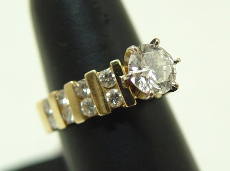 LOVELY LADY'S DIAMOND SOLITAIRE: Round brilliant cut diamond approx. 1ct, 6.8 x 6.8 x 4.2, I color, SI2 clarity - knife shaped feather from girdle to star facet partially disguised in a clever way by one of the 6 prongs, raised above a 14k yellow gold band with stepped sides channel set with 16 small round cut diamonds approx. .05ct each., approx. 1 3/4ctw diamonds, 5.6grams, size 7.