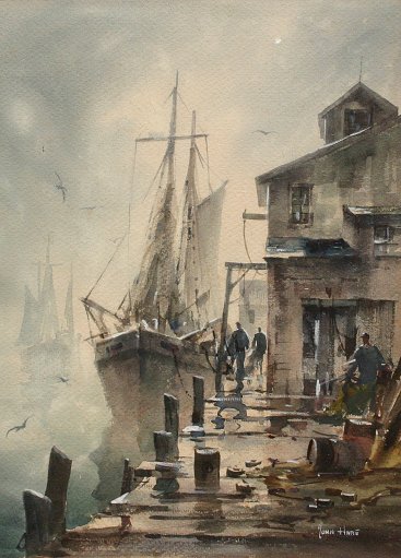 HARE, John, (American, 20th C): Dockside scene with boats and figures, W/C, sight size 16 1/4'' x 12'', signed lower right. Condition - Some faint spotted staining in the sky.