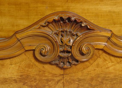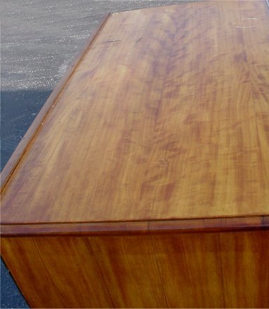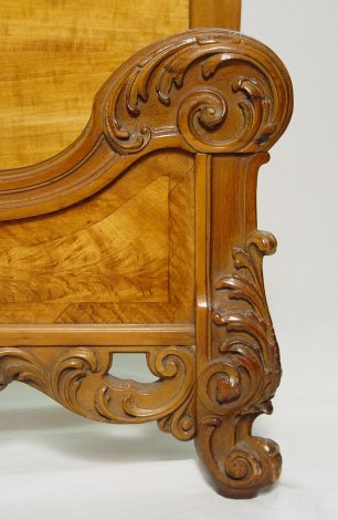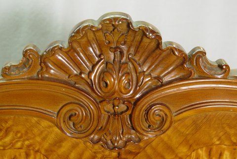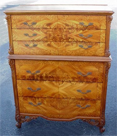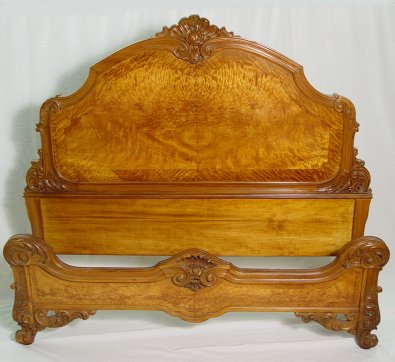 1920'S SATINWOOD FRENCH STYLE BEDROOM SET: Highly grained book matched veneers in a warm honey color. The set consists of full size BED with shaped headboard, six drawer CHEST ON CHEST with graduated drawers, 54 1/2'' x 41 1/2'' x 22 1/4''. Three drawer DRESSER, 36''h, x 52''w. DRESSING TABLE, 32''h, 54'' x 19''. and one door STAND, 32'' x 17''.