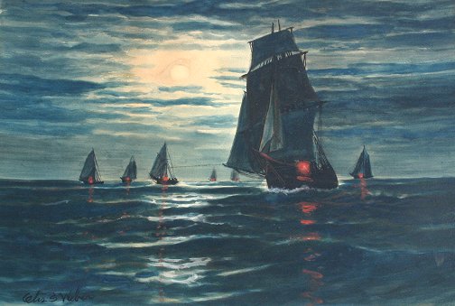WEBER, Otis, (American, 19/20th C): Clipper ships by moonlight, W/C, sight size 17'' x 25'', signed lower left, encased in a period wood and gilt trimmed molding with wear, 26'' x 34''.