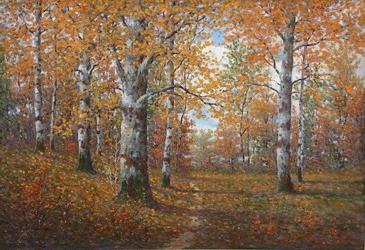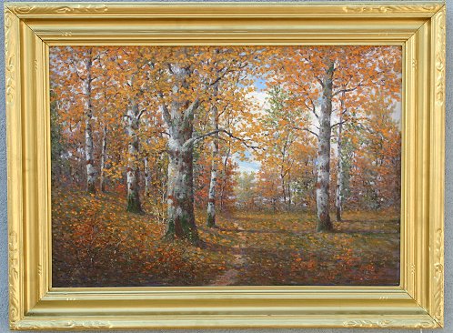 AMERICAN IMPRESSIONIST MIDWESTERN AUTUMNAL FOREST LANDSCAPE WITH BIRCHES ALONG A PATH, (Circa 1930): O/C, 18'' x 26'', no visible signature, but marked in pencil on the stretcher verso ''Mrs. E.A. Schroeder'', encased in a period gilded molding with wear.