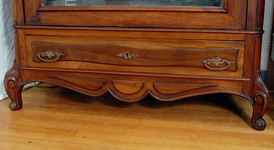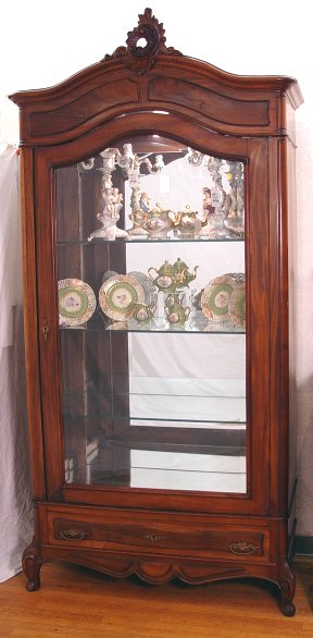 FRENCH ARMOIRE CONVERTED TO CURIO VITRINE: Carved walnut cabinet with single glass door, mirror back, glass shelves, 94''h, x 44'' x 21''.