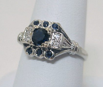 1920'S SAPPHIRE & DIAMOND RING: Lovely filigree mount featuring sapphires and diamonds. Center sapphire approx. 1/2ct round cut with 6 smaller round cuts approx. 30pts split top and bottom, 6 round diamonds set to sides, approx. 15pts. 14k white gold mount, Size 7 1/2, 3.4 grams. Est. $400/600**