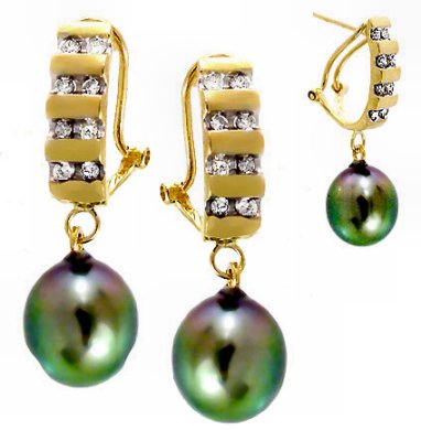 LOVELY TAHITIAN PEARL EARRINGS: Drop shaped natural color Tahitian black pearls, 9-10mm, dangling from a solid quality 14kt yellow gold omega style setting that has .33ct of white diamonds channel set in a 1/2 hoop bar style. The diamonds are .33cttw, and the earrings measure the perfect height of 1''. Est. $500/700**