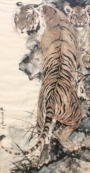 KONG, Ong Boon, (Taiwan, 20th C): Two tigers in a landscape, W/C, 53 3/4'' x 28 3/4''. Condition - Chop mark lower left margin and lower right, crease in upper left corner. The artist was flown from Singapore to the U.S. and commissioned to paint several paintings for a local businessman and entrepreneur several decades ago.