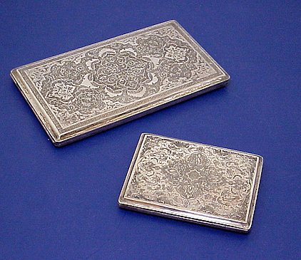 RUSSIAN SILVER CIGARETTE CASES: Engraved decoration. Vermeil interior. One is 5 1/2'' x 3 1/4'', the other is 3 1/4'' x 2 1/2''. Hallmarked with the Zolotnik standard of silver 84 (.875 silver).