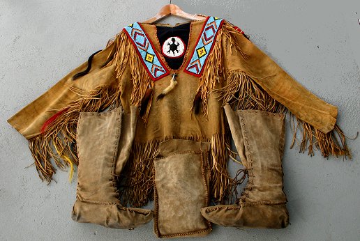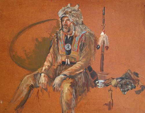 20TH C O/MASONITE PAINTING OF A MOUNTAIN MAN WEARING INDIAN BUCK SKINS: 22'' x 28''. Condition - Small crack in the upper left margin and several scrapes. Sold with the actual skins he was wearing in the picture which includes boots, a beaded jacket and belt pouch.
