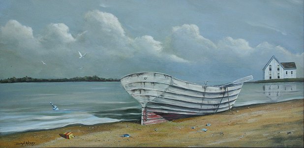 NEARY, Joseph, (American, 20th C): ''The Old Row Boat'', O/Masonite, 24'' x 48'', signed lower left, encased in contemporary wooden frame. Condition - Needs cleaning. In 1979, Joseph Neary was commissioned by Kenwood Vineyards for a series of wine bottle labels.