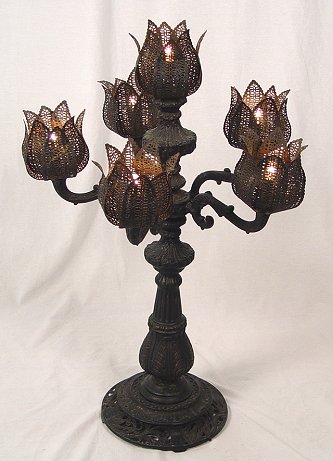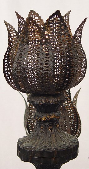 CAST METAL LAMP WITH PUNCH WORK TULIP SHADES: Six lights, 35 1/2''h, 23''w. Original patina.