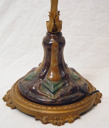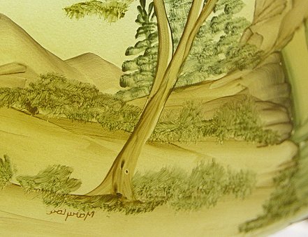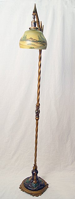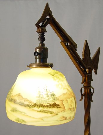 VINTAGE BRIDGE FLOOR LAMP WITH REVERSE PAINTED SHADE: Painted in a scenic landscape. Shade is 7'' dia., lamp is 62 1/2''h.