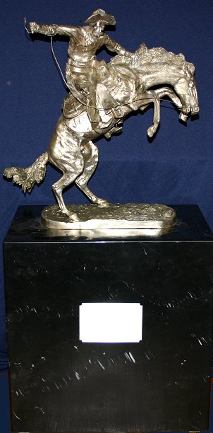 REMINGTON, Frederic, After, (American, 1861-1909): ''Bronco Buster'', silver cast metal sculpture after Remington by the Henry Bonnard Foundry, casting number 98/100, inscribed information on the base, affixed to a polished black marble plinth with some repaired chips to the top portion, 20 1/2'' h and total overall height is 41'' by 14''d x 20''w, overall height 41''.