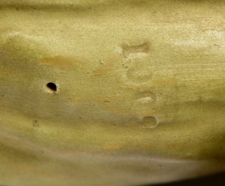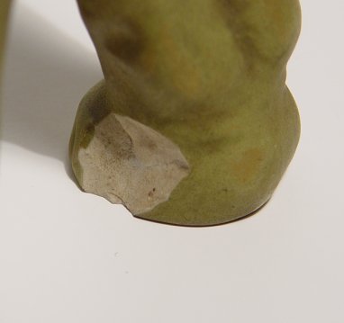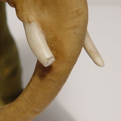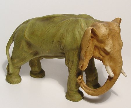 WELLER MOSKOTA ELEPHANT: Hard to find Weller elephant in the 11'' size in iridised glaze. Impressed numbers 100? on the underbelly and 42 under the foot. Please note unfortunate loss of half tusk and chip on foot.