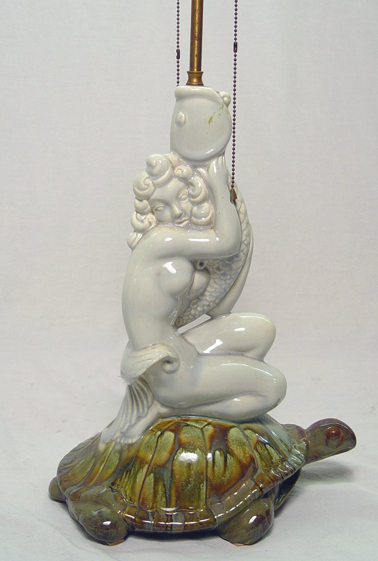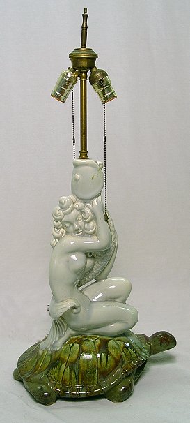 HAEGER POTTERY FIGURAL LAMP: Woman with fish on a turtle. Please note the angel fish finial has chip on the upper fin. The pottery part figure herself is 9''h. The turtle is 13 1/2''l.