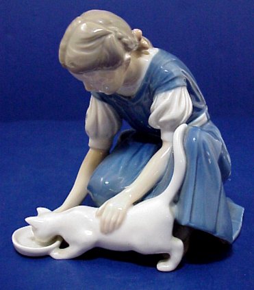 BING & GRONDAHL GIRL FEEDING CAT: #1745, young girl feeding a white cat. 5 1/2'' x06'' x 4''. No chips, cracks, or repairs.