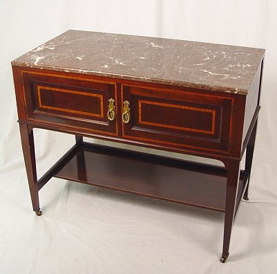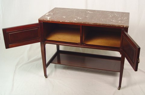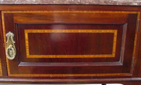 ENGLISH REGENCY STYLE MARBLE TOP SIDE CABINET: Parquetry inlay cabinet doors under a red marble top. 30 1/2''h. x 37'' x 20''.