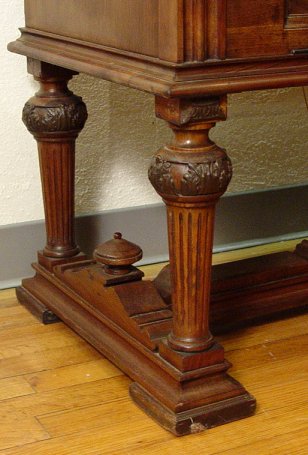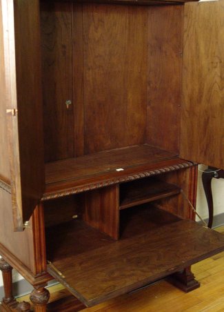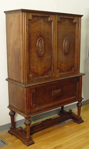 BURL WALNUT BLIND CHINA CABINET BY ALEXANDER BROS NY: Wonderful cabinet with two solid wood locking doors over dropfront raised base, slightly converted for use as an entertainment center (holes for cords), Ca. 1900, 18 1/2''d x 42 3/4''w x 64 3/4''h, includes key, label verso.