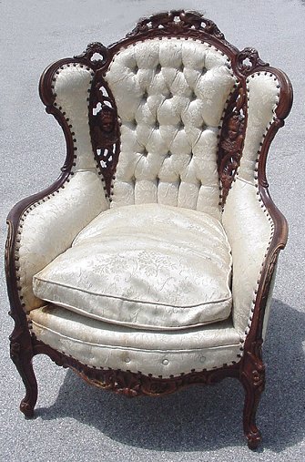 FRENCH RENAISSANCE REVIVAL CHAIR: Ca. early 20th C. Carved frame with top crest carved in birds. Tufted back, carved, open work sides with cherubic carving. Spotting on the upholstery. 44 1/2''h, 32'' x 33''.