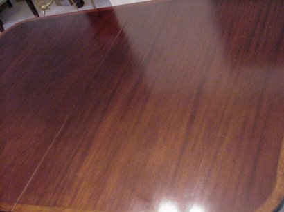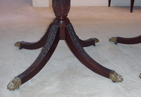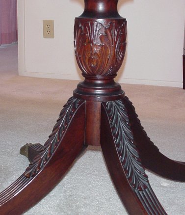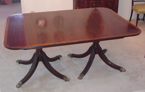 FINE BANDED MAHOGANY FEDERAL STYLE DINING TABLE: Burled walnut bands along the rim the table top. Carved acanthus leaf double pedestal bases end in splayed legs with brass claw foot caps. 48'' x 66'' opens to 90'' with leaves. Please note the two leaves are in very worn condition, each 12''wide.