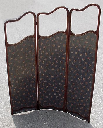 3 PANEL MAHOGANY SCREEN: Curved glass and fabric panels framed in mahogany, 69 1/4''h x 51 3/4''.
