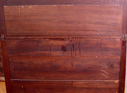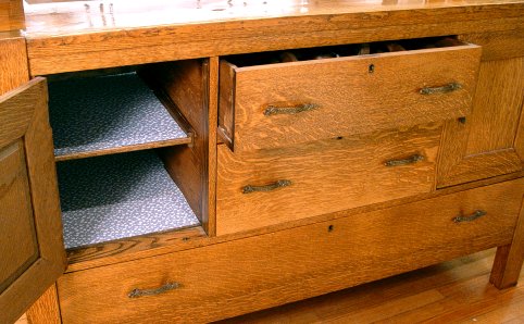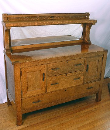 ARTS & CRAFTS OAK SIDE BOARD: Quarter sawn golden oak. Mirror backsplash with plate rail and grooves. Lower section has two center drawers flanked by doors over a full length drawer. Top surface has been covered in a coat of polyurethane. 59''h. x 61'' x 23''.