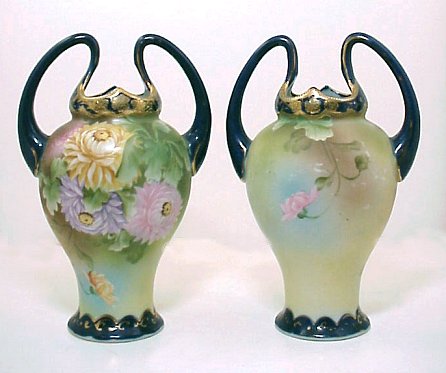 PAIR OF HAND PAINTED NIPPON TYPE JAPANESE PORCELAIN VASES: Gold beading and cobalt in the traditional Nippon manner. Hand painted floral decor. 9''h. No chips, cracks, or repairs.