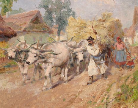 CSERNA, Karoly, (Hungarian,1867-1944): ''Oxen Harvest'', O/C, 16'' x 20'', signed lower right.