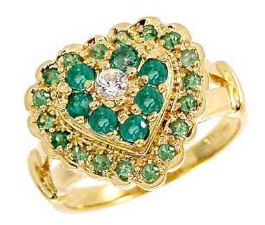 SPARKLING EMERALD, WHITE SAPPHIRE & TSAVORITE HEART RING: This unique ring features a white sapphire center surrounded by a row of Columbian emeralds and Tsavorite garnet in the shape of a heart. 14k yellow gold, size 7, 5.6 grams. Est. $250/300**