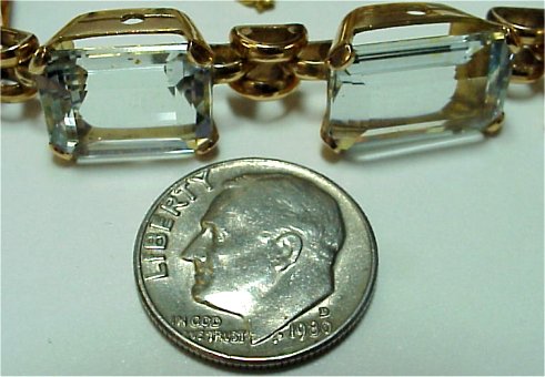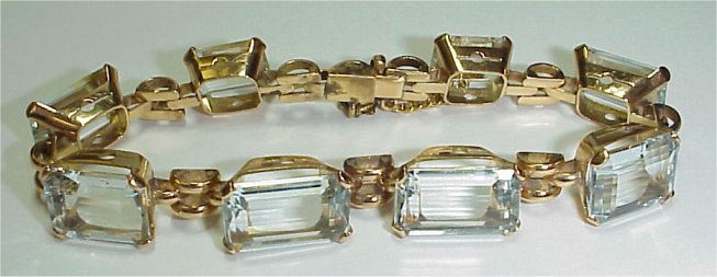 STRIKING AQUAMARINE ROSE GOLD BRACELET: Eight emerald cut natural aquamarines, graduated in size from 10mm x 15mm x 6mm to 8.7mm x 11.7mm x 5.6mm, very light blue in tone, pressure clasp marked 18k, 7''l., 26 grams, with safety chain. Sold with 1999 appraisal, replacement cost $3500.