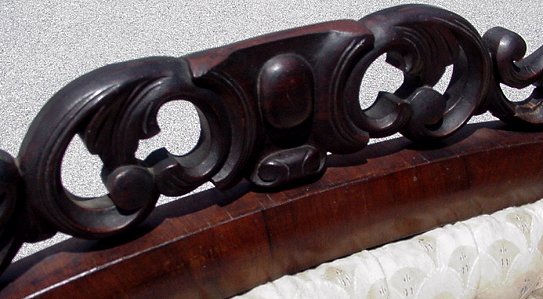 PERIOD EMPIRE MAHOGANY FRAMED SOFA: Center oval medallion has carved crest and tufted upholstory. Ogee mahogany frame, high scrolled arms. 85'' x 40''h x 30''.
