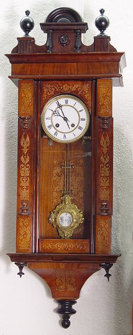 19TH C GERMAN REGULATOR CLOCK IN INLAY CASE: In good working order, enamel dial, key and ornate lady head masqueron pendulum. Ca. 1875-80. Approx. 36''h, x 13'' x 6''. Est. $400/500**