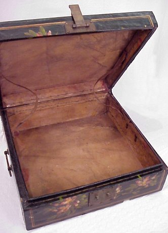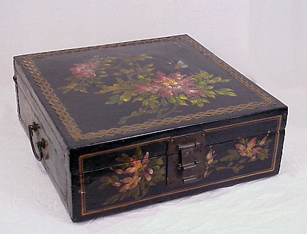 CHINESE PAINT DECORATED AND LACQUERED BOX: Side clasp and carry handle. Floral decorated with lone butterfly. Chinese characters. 5''h, x 14'' x 14''.