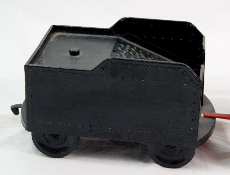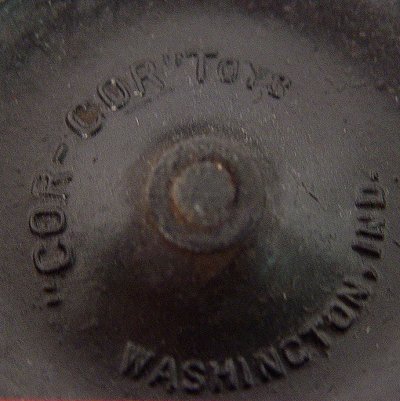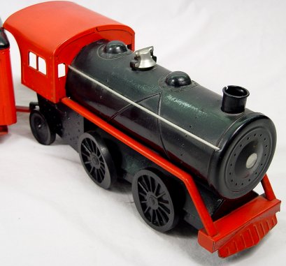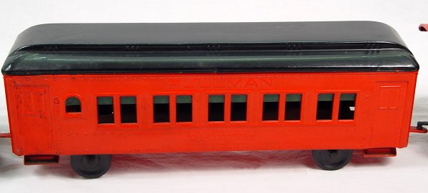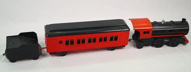 COR-COR TOY TRAIN: Corcoran Mfg. Co. of Washington, Indiana, Ca. 1920-40's. They specialized in Pressed steel riding cars and trains. This is a three part train, the engine is 18''l, coal car is 8 3/4''l, and the Pullman is 24''l. The pullman has raised letters 'Cor-Cor' Toys Washington Indiana. The wheels of each are also marked Cor Cor. Appears to have old repaint.