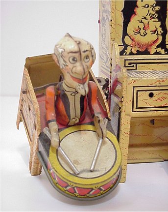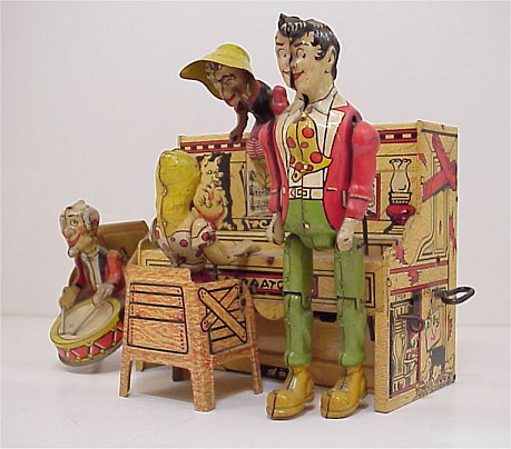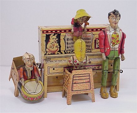 UNIQUE ART TIN WIND UP DOGPATCH BAND: The Dogpatch 4 complete with Daisy May playing the piano and Lil' Abner dancing. Key wind, in working order. Unique Art Manufacturing Co. of Newark N.J. The piano is 4''h. x 6 1/2''.