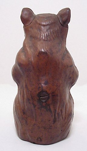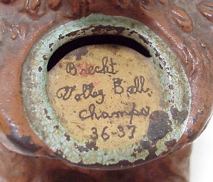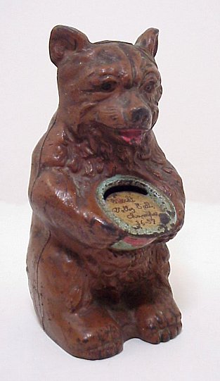HUBLEY CAST IRON STILL BANK ''BEAR WITH HONEY'': Original paint with minor loss. Top of honey pot is engraved ''Brecht Volley Ball Champs 36-37''. 6 1/2''h.