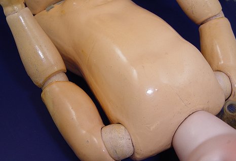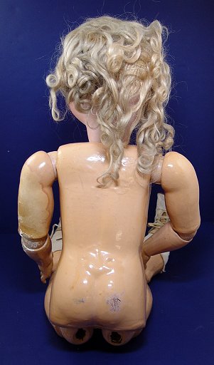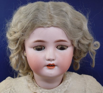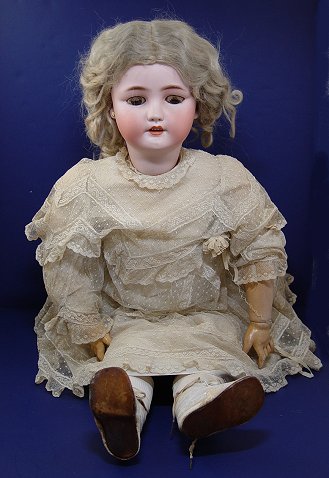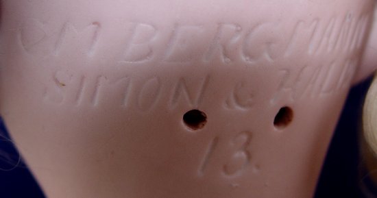 SIMON & HALBIG BERGMANN DOLL: Simon & Halbig bisque head for the Charles M Bergmann Co. Sleepy brown glass eyes, open mouth with four teeth showing. Back of head marked ''CM Bergmann Simon & Halbig 13''. Fully jointed wood body with all fingers. Some wear to the compo over the wood. Fabulous lacy dress of the period. Approx. 29''h.