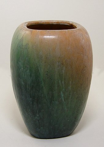 ART POTTERY VASE: Unidentified art pottery vase with an unusual drip glaze. Squarish cylindrical form. 9''h, white clay, unmarked. Est. $200/300**