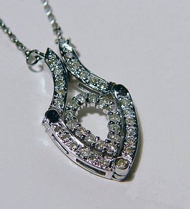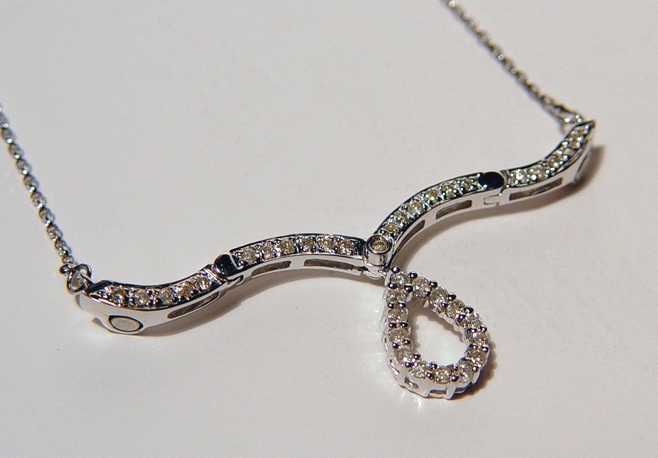 AMAZING TWO WAY DIAMOND NECKLACE: 14k white gold converting necklace encrusted with diamonds. Approx. .41ctw of round cut diamonds in a pendant that is either a scroll with tear drop or a shield. Tiny magnet holds in place, 18'' to 20''l.
