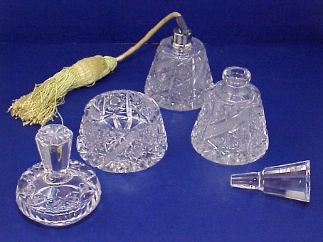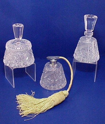 3 PIECE CUT GLASS DRESSER JARS AND PERFUME BOTTLE: Fine cut glass set includes an atomizer with fringed bulb, covered jar and perfume bottle each with a tall faceted stopper and cover. 3 1/2'' dia. 4 1/2-6''h.