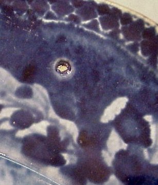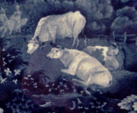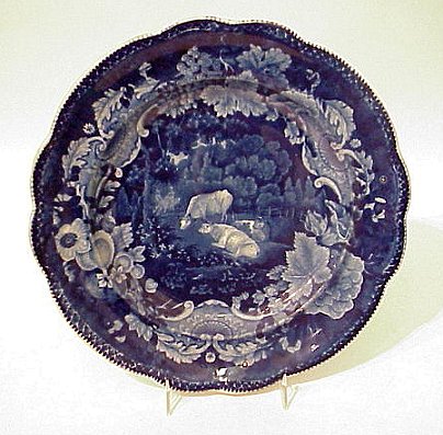 ADAMS STAFFORDSHIRE BLUE TRANSFERWARE PLATE: Ca. 1804-1840. Unidentified pattern featuring cows surrounded by grapevine and floral border. Impressed ''Adams Warranted Staffordshire'' mark. Scalloped rim, no chips, crows feet hairline visible on back. 10 1/4'' dia.