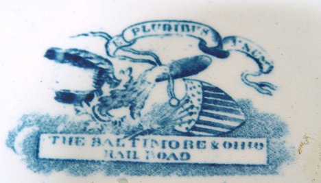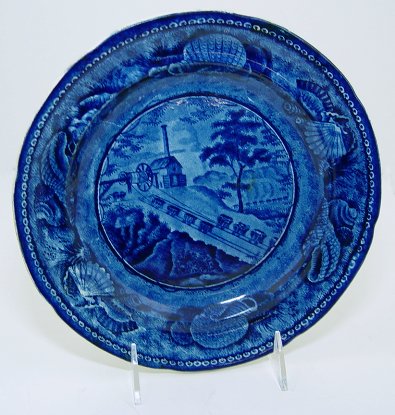 HISTORICAL BLUE STAFFORDSHIRE B & O PLATE: American scene commemorating the Baltimore & Ohio Railroad. 9 1/8'' dia. Impressed mark ''Wood'' for Enoch Wood & Sons. No chips or cracks.