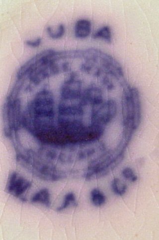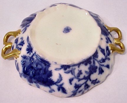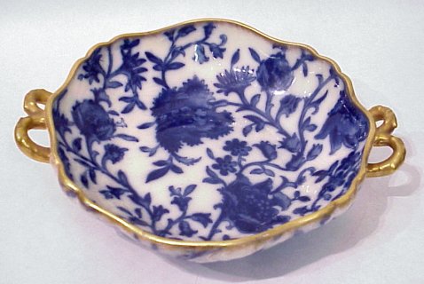 ENGLISH FLOW BLUE BOWL IN THE CUBA PATTERN: Gold rim and handle, decorated on the interior and exterior. 10'' dia. excluding the handles, 2 3/4''h. No chips or cracks, slight crazing.