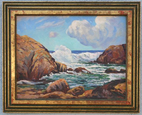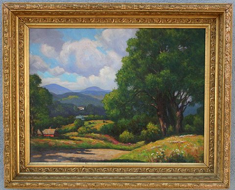 WARD, Arthur E., (American, 20th C): Two piece painting lot to include; ''The Maine Coast'', O/CB, 12'' x 16'', signed lower right, encased in original worn gilt frame, titled verso. Condition - Several flecks of paint loss missing in the sky and in the right margin. The second piece is titled ''Summertime in the Berkshires'', O/CB, sight size 13 1/2'' x 17 1/2'', signed lower right, signed and titled in pencil verso, encased in early 20th C. embossed gilt molding with gold overpaint and repair with missing gesso. Condition - Several missing flecks of paint loss in the sky.