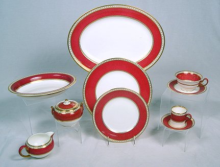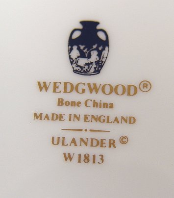WEDGWOOD ''ULANDER'' FINE CHINA SERVICE: 38 piece service to include 8 dinner plates, 8 salad plates, 7 bread plates, 8 cups and saucers, 3 demi-tasse cups and saucers, 15'' platter, oval vegetable bowl, creamer and sugar. No chips or cracks.